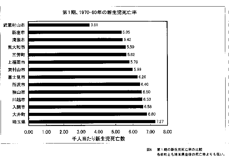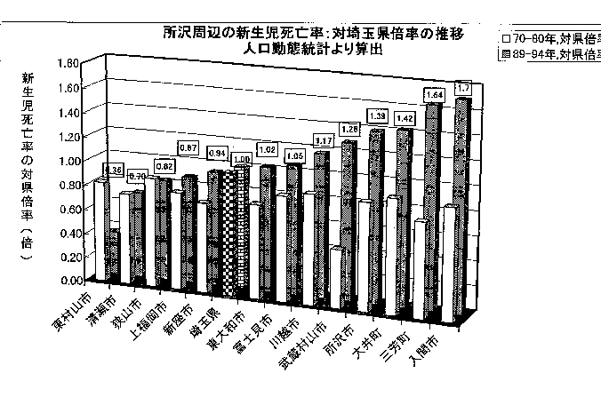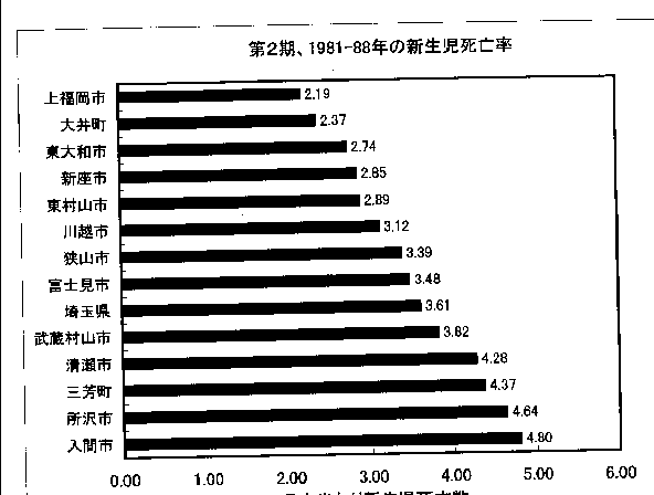 くぬぎ山〜所沢インター周辺の産廃焼却施設密集地域とその周辺における健康被害調査を行ったところ、この密集地域を抱える所沢市、三芳町、大井町そして入間市において、最近6年間の新生児死亡率(出生後4週間末満の新生児千人当たりの死亡数)が県平均より1.4〜1.7倍も高いことが明らかになりました。この調査結果について報告します。使用したデータは厚生省の人口動態統計です。