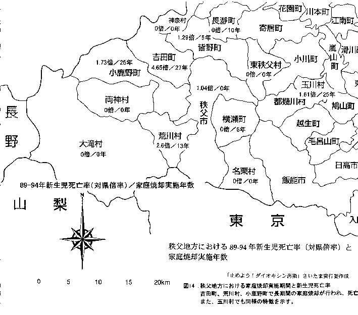 以上のことから判断すると、家庭焼却もダイオキシンの重要な発生源となっており、特に埼玉県秩父地方の吉田町、荒川村、小鹿野町などでは、長期間の家庭焼却が、乳幼児の高死亡率に大きな影響を与えている可能性が指摘されます(図14)。