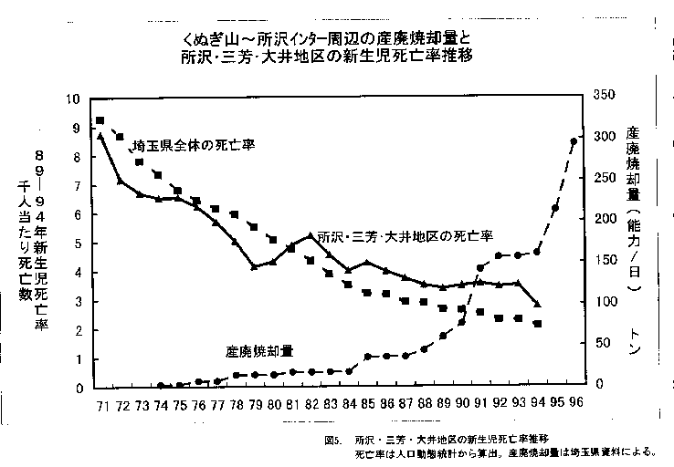 以上の結果は、入間市、三芳町、大井町、所沢市で新生児死亡率が高くなった時期と産廃焼却量の増加時期に対応が見られること、および産廃焼却施設の密集地域と高死亡率の2市2町が良く一致することを示しています。その原因はともかくとして、密集地域で深刻な健康被害が発生していることが初めて明らかになったのです。