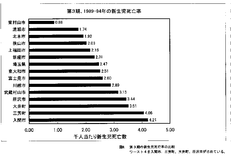 くぬぎ山〜所沢インター周辺の産廃焼却施設密集地域とその周辺における健康被害調査を行ったところ、この密集地域を抱える所沢市、三芳町、大井町そして入間市において、最近6年間の新生児死亡率(出生後4週間末満の新生児千人当たりの死亡数)が県平均より1.4〜1.7倍も高いことが明らかになりました。この調査結果について報告します。使用したデータは厚生省の人口動態統計です。