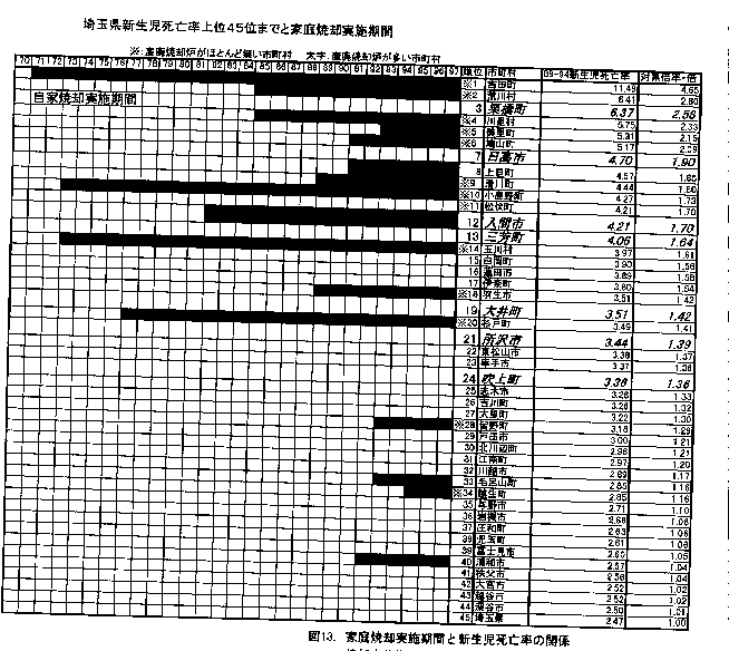 ゴミ焼却で野放しになっているのは、他でもない家庭焼却です。埼玉県の全市町村における新生児死亡率ランク(89−94年)と、家庭用簡易焼却炉の購入補助実施市町村を比較した結果(図13)、恐るべき事実が明らかになりました。その要点を次にまとめます。